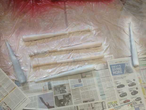 Mientras la pintura en el seco de palos rojos, seguir adelante y pintura blanca los palos restantes. 3 completa con palos y Bates rotos 3.