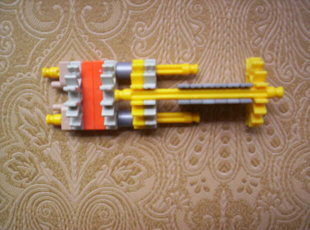 este arma es una pistola de 8 banda de goma tiro semiautomático con un giro, su hecho totalmente de K'NEX!!!!!! Cuando lo piensas bien es un muy simple mechinism, me topé con él mientras estaba tratando de disminuir el índice del fuego de un arma tot