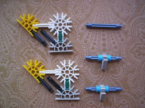 blanco y negro de 6 barras. 4 conectores amarillo/gris. 4 separadores azules. 3 varillas azules. 2 dos conectores de la ranura. 2 conectores de círculo. 2 verde/negro.
