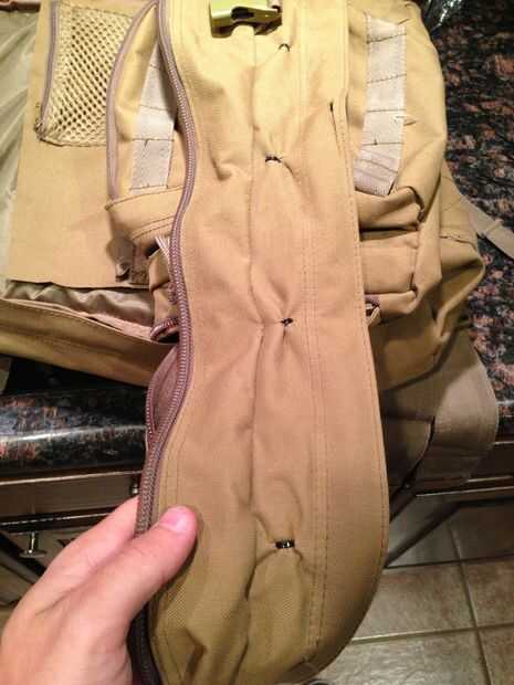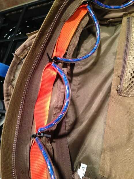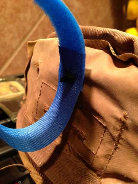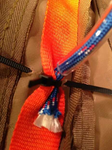 - Utilizando como guía los lazos zip en tu portamaterial, hacer dos incisiones muy pequeñas a cada lado de la cuerda en su mochila.