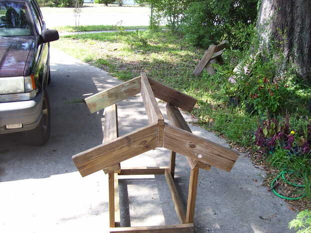 Coloque el techo en la parte superior del marco de la casa y todo cuadrado y atornille a través de las vigas de L en las vigas para sujetar el techo. Se cortan los bordes de la cubierta de 2x6s a (aprox. 41 pulgadas de largo.)