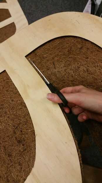 Con un fuerte par de tijeras, corte la estera de coco, después a lo largo de las fronteras de la letra. Un cortador puede ser útil para meter un agujero en la estera si necesita cortar interior de partes de las letras (como la una).
