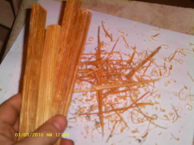 Simplemente deslice la cuchilla fina a lo largo de la pieza de fatwood en aproximadamente un ángulo de 10 grados, las rebabas serán coger el cuchillo y cortar fácilmente, dejando un pedazo de fatwood que costumbre dar las astillas cada vez que utilice. (ADVERTENCIA: siempre corte lejos de su cuerpo, nunca hacia usted ya que puede ocasionar lesiones)