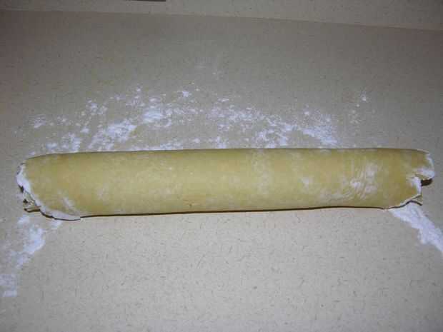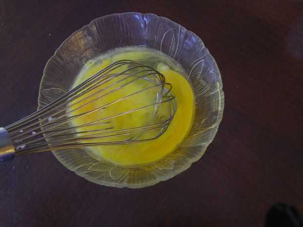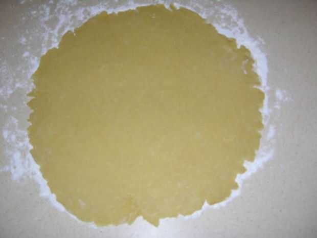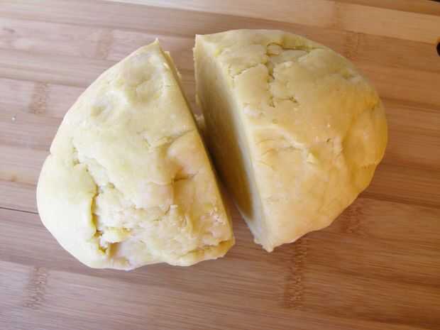 Batir el agua con huevos y yema de huevo y agregar las migas de harina la mantequilla y mezclar hasta que la masa es quebradiza pero mantiene unido cuando se aprieta, forma suave masa, dividir en mitades.