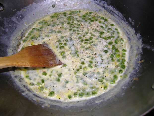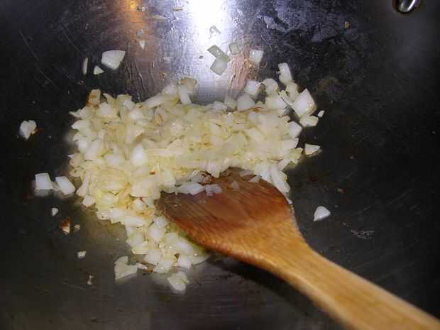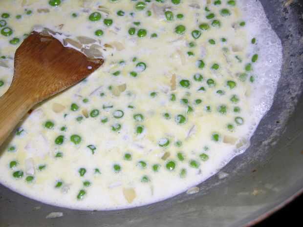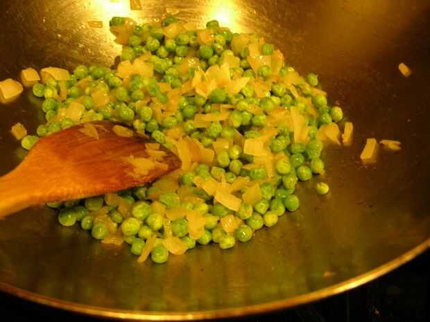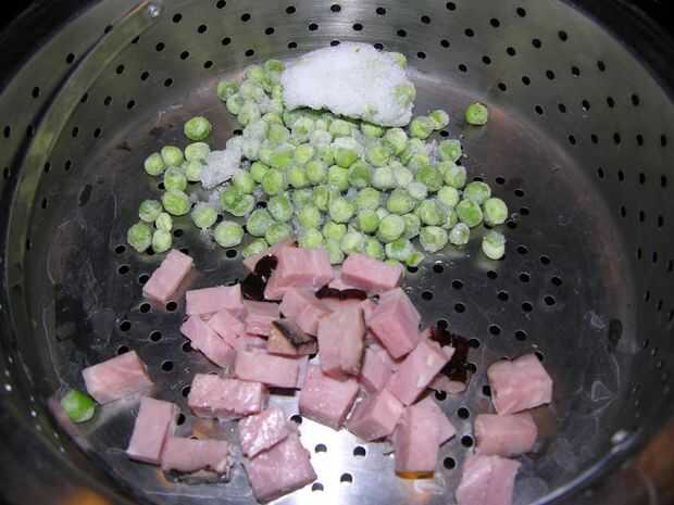 Mientras freír la cebolla y los guisantes, el jamón y los guisantes reservados en otra olla de vapor.