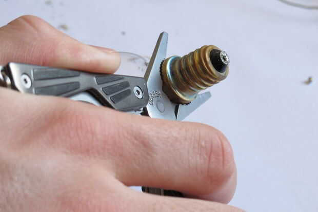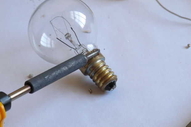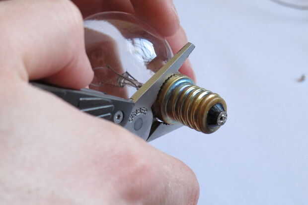 Ahora agarra la parte metálica de la bombilla cerca del cristal con las pinzas y aplique poca presión en las pinzas. No quiere romper el vidrio! Seguir trabajando en el metal torcer un poco la bombilla y aplicando presión otra vez. Usted quiere ir en todo el borde así que gire la bombilla un poco después de cada exprimir.