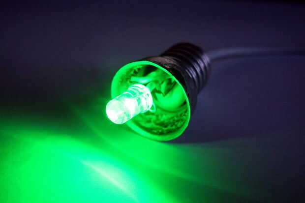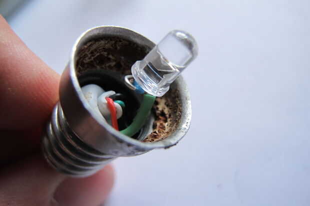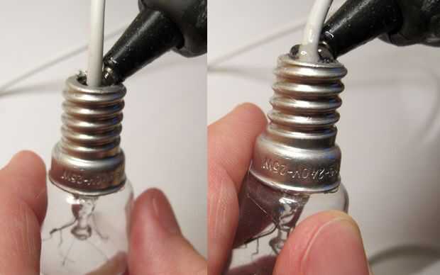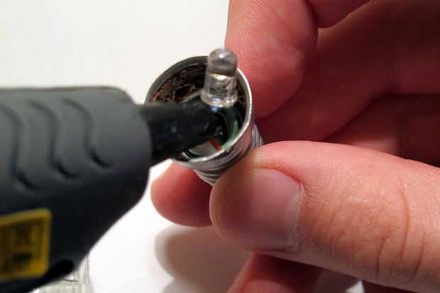 Por último, el punto donde el cable sale de la bombilla debe ser gued. Aplique pegamento caliente mientras vuelta la bombilla a constand velocidad.