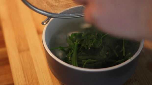 Después de 30 segundos, retire las hierbas de la estufa y drenaje, inmediatamente dunk las hierbas en el agua helada. Esto detener de inmediato la cocción y ayudan a mantener un vibrante color verde. Necesita ser rápido aquí, el más largo sus tallos de hierbas después de ser drenado o sentarse en el agua más el color verde que se pierde.