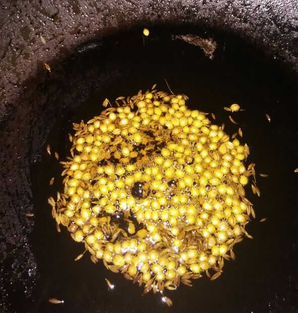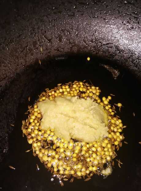 5. freír semillas de cilantro, semillas de comino, semillas de alholva, curry hojas y nigella hasta pop.