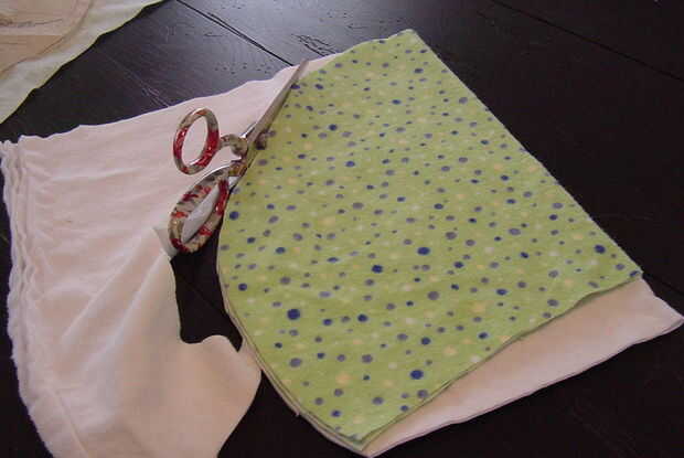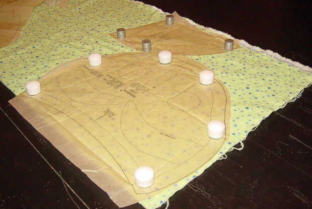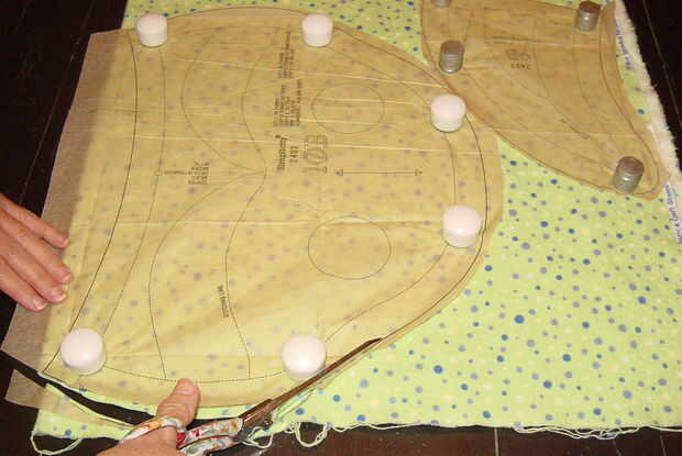 Usando a una tela como franela es grande. Era mucho más fácil tener una de las piezas de franela color como un patrón al que cortar la franela blanca relleno de guata, en lugar de las piezas del patrón. Fue necesario utilizar pesos... clase de "pegados" entre sí.