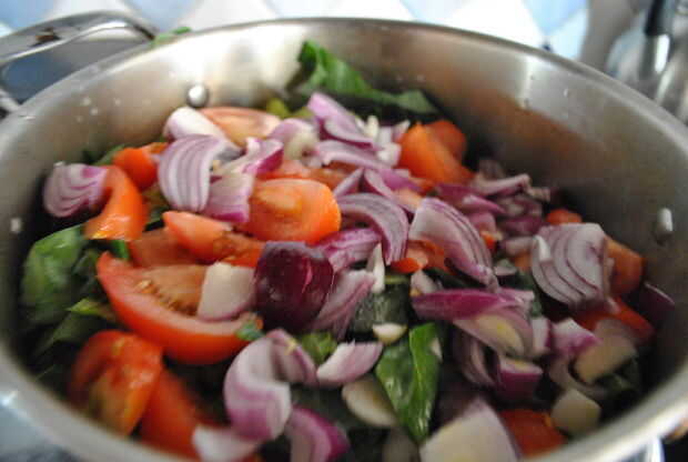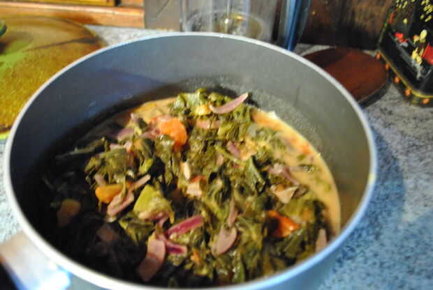2. Añadir la leche de coco y hervir suavemente por 10-15 minutos. Las cebollas, tomates y coco deben formar una salsa espesa.