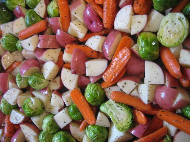 Coloque todas estas cosas en la bandeja y aplique sal, pimienta y las hierbas secas. Quieres una cantidad uniforme de todo. Luego, rociar aceite de oliva por encima y mezcle con las manos para cubrir. Añadir más aceite de oliva si sus vegetales carecen de un brillo.