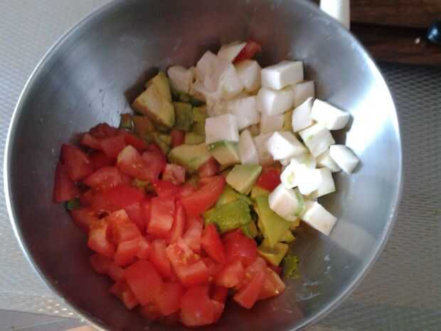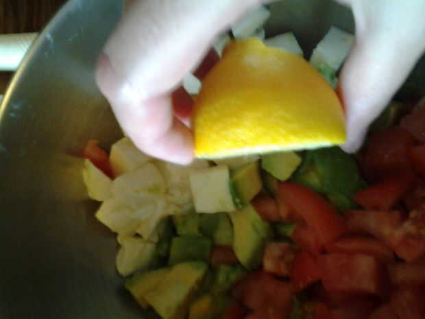 Cortar en cuadritos el tomate y la mozzarella y añadir a la palta. Añadir sal y pimienta y espolvorear algo de zumo de limón en la parte superior. El limón hace el sabor del aguacate salido mejor y evitar que gire marrón.