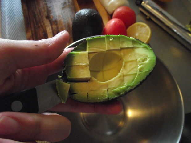 Cortar los aguacates por la mitad y quitar la semilla. Luego corte el aguacate en dados. Una manera fácil de hacerlo es la siguiente:
