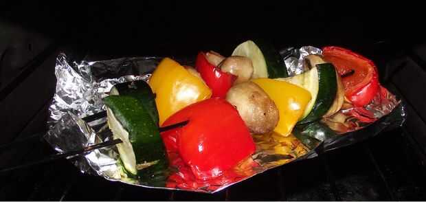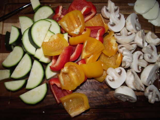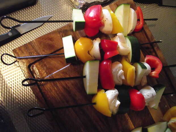 Trocear el pimiento y el calabacín en plazas o en mitades, pero recuerde que tienen que ser lo suficientemente grande como para poner un pincho a través de. Las setas más pequeñas usted puede guardar todo, cortar los más grandes en la mitad. Poner las verduras y setas en los pinchos en orden aleatorio y espolvorear algunos aceite de oliva, sal y pimienta en. En el horno: poner en un papel de estaño. Poner las brochetas en el horno / en la barbacoa hasta hecho. En la barbacoa, no olvide hacer los pinchos para que te se bien hechos en todos los lados. Pero ten cuidado, como son asar las verduras empiezan a conseguir sueltas en el pincho y la diapositiva de fácilmente.