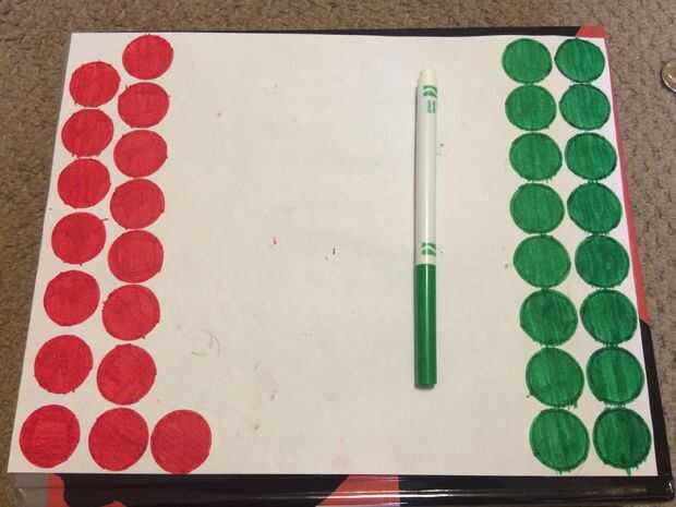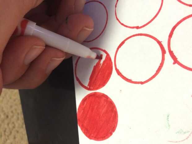 • Rellene los círculos con el color respectivo. Esto creará 32 total piezas de dos colores distintos.