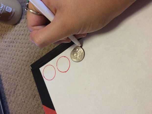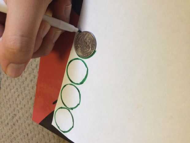 • Usando un cuarto o un objeto circular de tamaño similar, rastro 16 círculos sobre la hoja en blanco de papel con uno de los dos colores de marcadores o lápices.