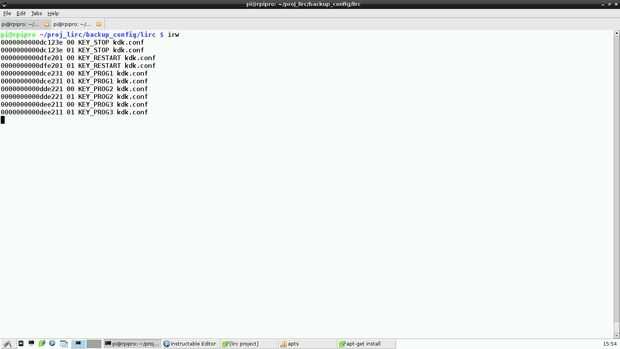 El programa irw mostrará el evento LIRC (KEY_STOP, KEY_RESTART) que corresponde al código IR enviado por la unidad de control remoto, /etc/.lirc/lircd