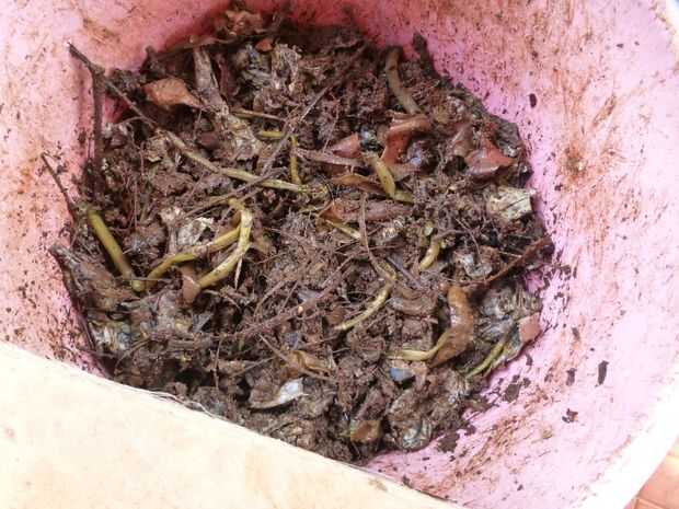 El cubo cubierto con gusanos se ha colocado en un área sombreada para que ninguna luz del sol cae sobre ella.