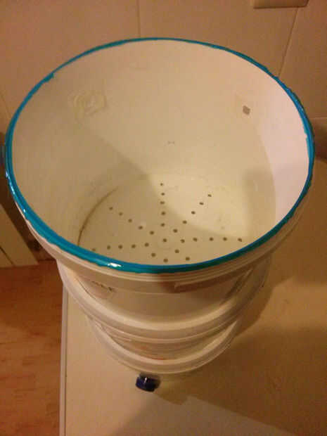 También hecho unos agujeros en la parte de arriba de cada cubo para el sistema pueda respirar y no se concentren gases (y huela mal) ni se ahoguen las lombrices. Están protegidos con más malla mosquitera para evitar fugas o intrusiones, no es nada recomendable entren mosquitos u hormigas (las últimas sobre todo porque matan a las lombrices).