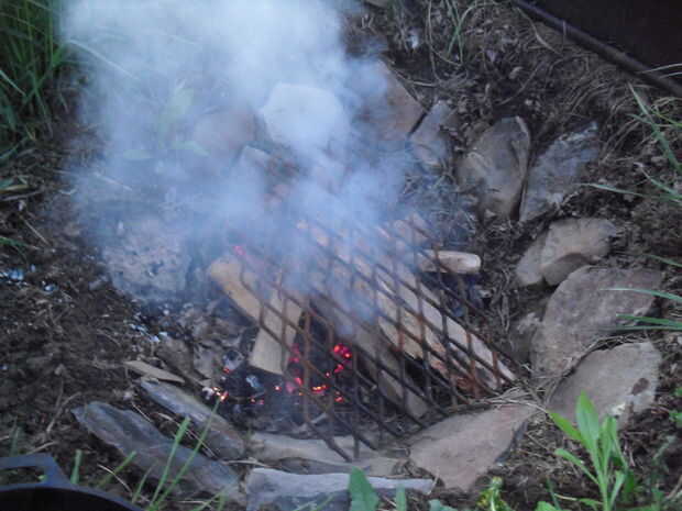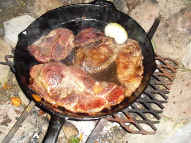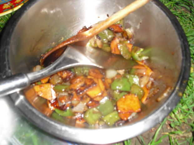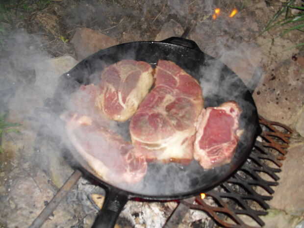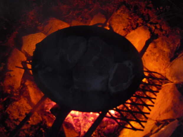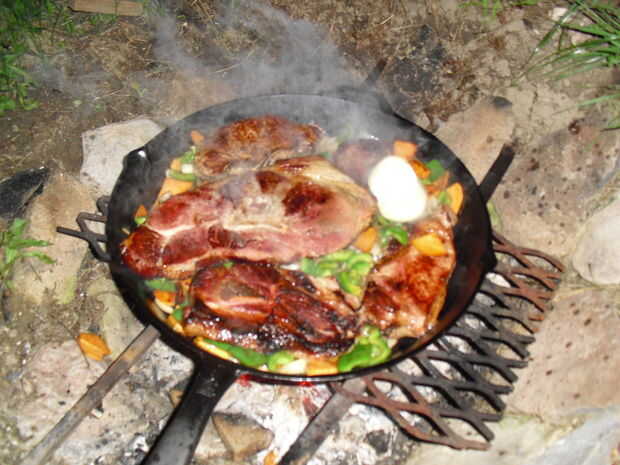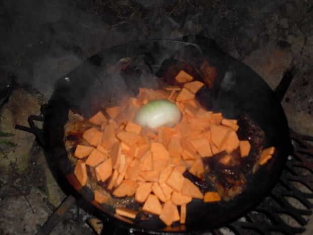 gusta cocinar fuera? No hay nada mejor en la vida de una vista impresionante, buena cerveza artesanal y carnes de la zona para cenar una impresionante hoguera con amigos. Las verduras son la cebolla de la patata dulce, blanco, verde pimienta Corte todo áspero. LongTrail botellas. Los niños no lo hacen solos o sin supervisión, se trata de fuego y una sartén de hierro fundido caliente...! Ese pan se pegará a tu mano su tan caliente... ¡ NO TOQUE LA BANDEJA CON LAS MANOS! No es que he no esta pero como cocinero he visto hacerlo muchas veces... simplemente no lo hacen por favor.