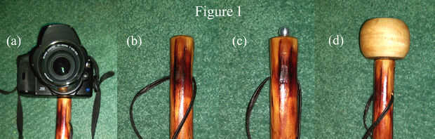 Recientemente, hemos visitado las montañas de la carpa a las afueras de Santa Fe NM con varias cámaras y el equipo a cuestas. Por desgracia, nos olvidamos de nuestra trípode en casa aunque nos trajo un bastón para estabilizar los huesos viejos, golpear cualquier repugnantes alimañas que podrían cruzar nuestro camino y para mover el pincel. Para tomar la foto, el conjunto de cámara y lentes de largo alcance son fáciles de apoyar en el ladrón/el codo del brazo para proporcionar maniobrabilidad y estabilidad bastante buena. Igual, hay veces cuando desea que un fotógrafo para un trípode o incluso un monopié pero no el extra peso y aparatos. Nos dimos cuenta de que sería una simple cuestión a modificar nuestros bastones favorito para las cámaras (Figura 1a) y añadir algunos adornos útiles como una bola de aluminio (Figura 1 c) o una bola de madera (Figura 1 d). Básicamente las modificaciones requieren sólo una púa t-tuerca y un tornillo de cabeza hueca como especificado en el texto, así como en la lista de resumen en el paso 8.