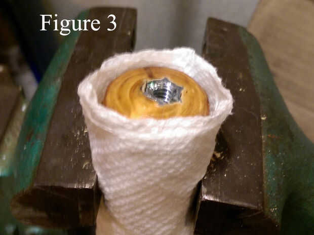 La parte superior del bastón de tendrá a lugar firme para perforar un agujero. Se utilizó una prensa para segurar la constante. Envolver un par de toallas de papel en el palillo antes de la fijación con abrazadera en el tornillo de banco para que la presión de sujeción no daña el acabado de la palanca. En lugar de un tornillo de banco, sería posible utilizar pinzas de madera para sostener el palo contra una mesa y perforar lateralmente o, cuidado, mantenga presionado el stick con la mano y perforación. Por desgracia, no fotografiamos el palillo envuelto antes de taladrar el agujero pero nos 'promulgar de nuevo' el escenario después de martillar el tornillo en su lugar (Figura 3). No martille en el palo mientras sujeta para evitar daños en los lados del palillo.