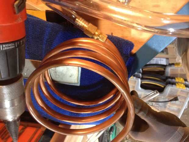 Tuve esta puesta alrededor de un proyecto que hice en la bobina de cobre que usaba una pequeña nevera para guardar mis pececillos fresco durante los meses de pesca de verano. Es de cobre suave de media pulgada, como comúnmente se utiliza para líneas de gas o refrigeración. Las guarniciones estaban encendidas allí así que salí no son realmente necesarias debido a que el tubo transparente flexible es un calce sobre el tubo. Como veis que he usado algunos de la tubería clara entre la caja de agua y el serpentín de enfriamiento, con el fin de evitar la transferencia de calor innecesarios de la caja de agua en el serpentín de enfriamiento y también para proporcionar una vista del vapor generado.