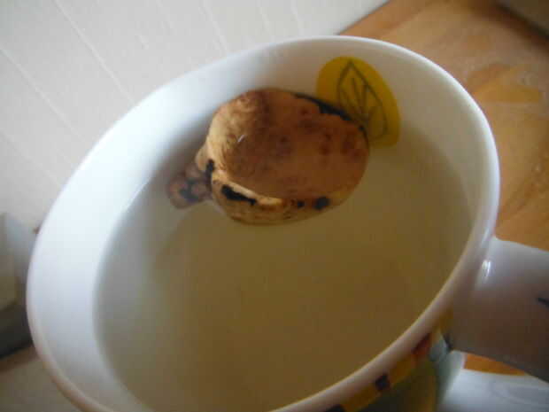 Visto ya que era un pedazo pequeño y una madera ya pensé que no necesitaría mucho tiempo. Llena una taza con agua hirviendo de la tetera, agregué sal y dejado en remojo durante unos 20 minutos.