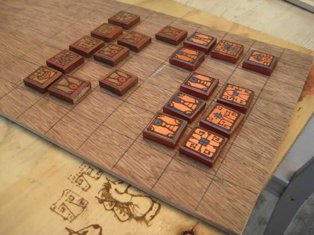 Puesto que mis piezas de ajedrez eran cuadrados de 1 x 1. Plazas de colocación levemente más grandes eran necesarios. Para hacer esto a cambiado de puesto mi regla de redacción (que tenía un ancho de 1 pulgada) un poco y continuó hasta que conseguí un 6 plazas para 5 plazas para la anchura y longitud. Coloca las piezas en fila para comprobar el ajuste. Trabajan.