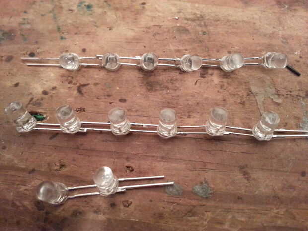 Los leds son el foco principal detrás de esta construcción. Ahora se ejecutará estos leds en paralelo, que parece ser una tarea desalentadora. Si tuvieras que conectar LED en paralelo antes con no PCB entonces las probabilidades son usted conectado con un montón de alambre. No te preocupes yo uso para hacer lo mismo! :/ Hasta que encontré una forma muy agradable de correr tantos como desea en paralelo con ningunos alambres en todos! Yo no puedo tomar el crédito por este método. Vi dino de hack a la semana utilizar este método. Había doblado de los cables de los leds y utiliza los cables para conectar en paralelo. Primero pensé en ver esto era '' wow, soy un idiota para más mirando este ''. Ofrecemos montaje 18 leds en un lado de la patineta y 18 en el otro lado. Nos se suelda dos juegos de 6 y 3 juegos de 2. todos juntos podemos soldarlos pero luego el efecto de la luz se verá mal porque las luces se centrará en un área. Si separamos los Obtén un mejor resultado!