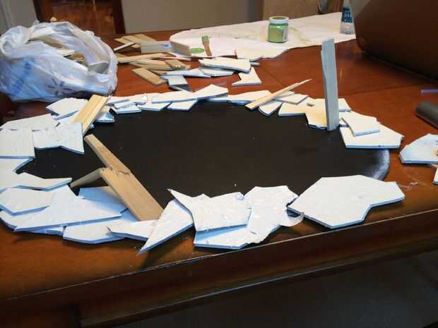 Paso 2 pintura de aerosol todas las formas irregulares cualquier color que haya seleccionado. Hice un blanco apagado para mina que podría también (antes de la pintura) rocíe un material texturizado si te gusta un look más realista... Una vez que la pintura está todo seco (hizo frente y dorso) usted puede caliente pegamento alrededor del borde del óvalo negro. En áreas intermitentes puede pista en los palillos rotos