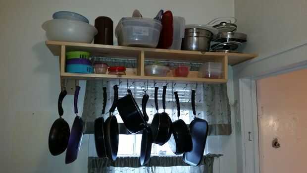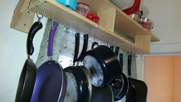 Único a este estante está por debajo de la principal plataforma es una plataforma flotante más pequeño para sostener objetos pequeños. Entonces que es personalizados ganchos para sostener ollas y sartenes.