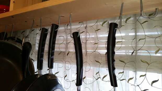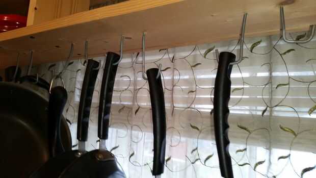 Siguiente resistencia el cable que viene por la parte inferior de la plataforma a su deseo de estética. A continuación, utilizando pinzas o curva una bonita curva en forma de C en la parte inferior del alambre que el extremo del gancho de agarre. Mis ollas y sartenes varían mucho en grosor de mango para que mi ganchos varían en tamaño para tener en cuenta. Me encontré con ganchos de diámetro más grandes funcionados mejor todo. Prueba con sus ollas y ajustar hasta que woks buenos para usted.