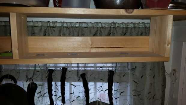 La rejilla de la olla fue construida en el estante inferior. Antes de instalar el tablero del estante perforé muchos agujeros en el tablero con una broca de 1/4 pulgada. Espaciar los agujeros par igual manera dos agujeros cerca unos de otros (aprox. 1.5") del grupo bajar de 4 a 6 pulgadas y poner otro par.