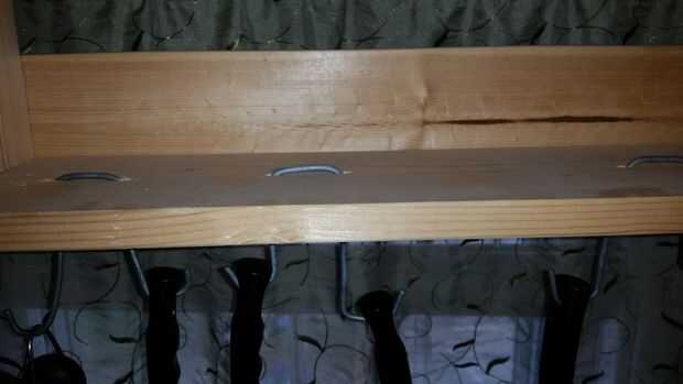 Para hacer los ganchos es fácil. Un trozo de alambre se va a hacer dos ganchos. Corte una longitud de alambre de alrededor de 6 a 9 pulgadas. Coloque el cable en uno de los agujeros perforados en la placa de la plataforma. Doble el cable al agujero emparejado y empújelo a través. Trate de mantener la longitud del cable que sale de cada agujero incluso. Utilice un martillo para aplastar el alambre a través y libra una sangría en el estante donde el cable va a vivir.