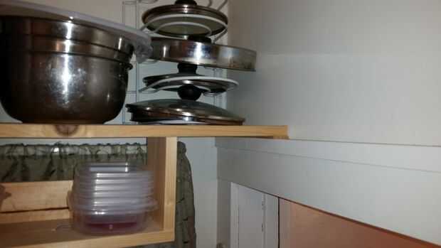 Tupperware es cada pesadilla de almacenamiento de cocina. Mi pequeña cocina diseño pobre amplifica este problema. Otro problema, misma solución. Hice un estante para sostener gran parte de ella.