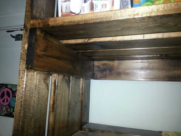 Para una plataforma tan grande no puede llevarse a través de una puerta regular. La plataforma tuvo que poner juntos en el dormitorio. Una vez que se instalaron estantes superior e inferior de thw el resto es una brisa. Dos tornillos en cada extremo del estante en las calas.