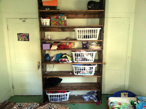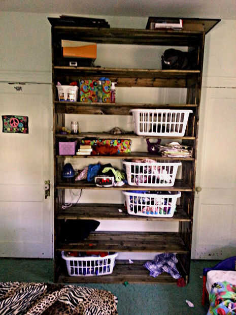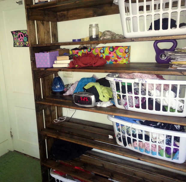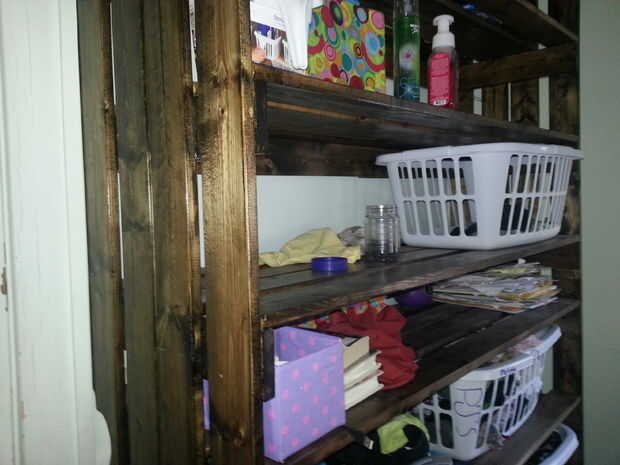 Estos estantes se hacen de madera de 1 x 4. Las juntas están espaciadas con cerca de 1/2 pulgada entre todos ellos que la profundidad de 16 pulgadas. Esto corresponde muy bien con cestas de lavadero. Todos los estantes se espacian aproximadamente 18 pulgadas verticalmente entre sí excepto un corto de cosas raras como el reloj.