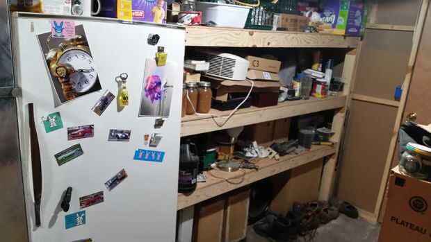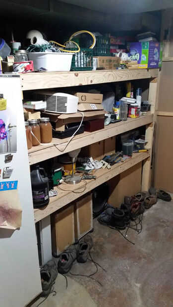 Este estante se encuentra en mi sótano. Es un estante pesado grande de 2 x 4 y 1/2 pulgada de madera contrachapada CDX. Está diseñado para almacenar un montón de cosas. Sobre todo mi equipo de música y las probabilidades y termina. Yo estimo que cada bandeja podría soportar al menos 200 o 300 libras de peso igualmente distribuido.