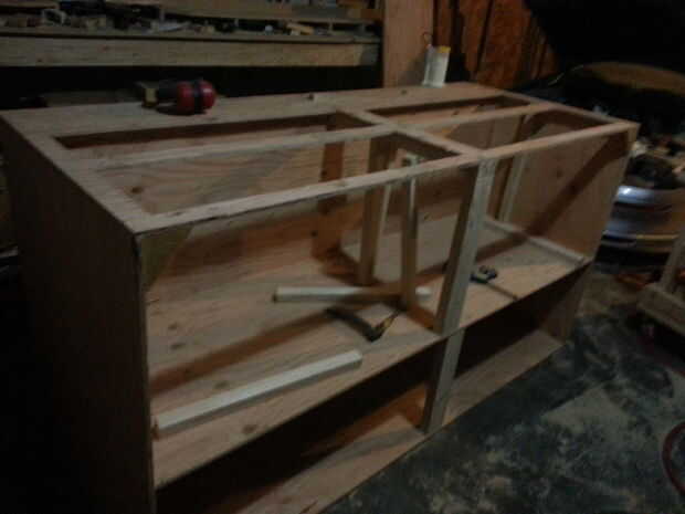 A continuación la cara de la estructura de rectángulo tiene que tener los cajones cortan aberturas. Describen el área a cortar con una gran plaza T y me corte las aberturas con una sierra de calar. Los soportes para las correderas se hacen de 2 X2 de madera e instalado en este punto. Es crítico que estos iguales uno al otro y cuadrados. Diapositivas del cajón tienen que estar bien alineados o no funcionarán operario. No soy un maestro de cajón y no tienen grandes pistas para esto.