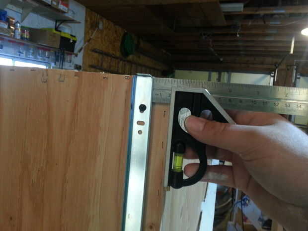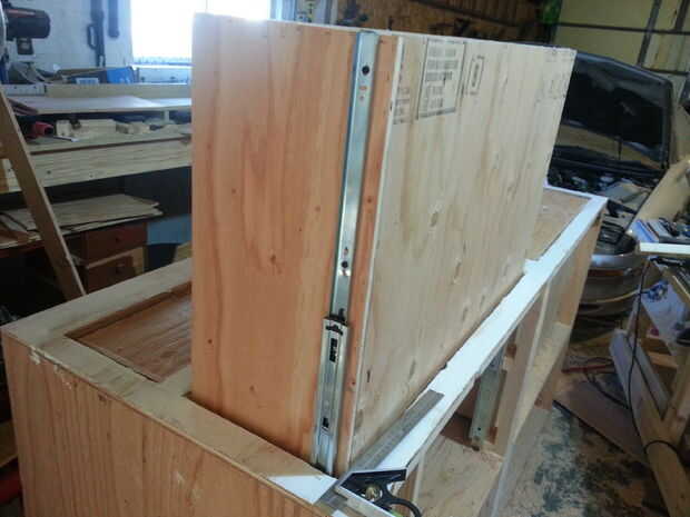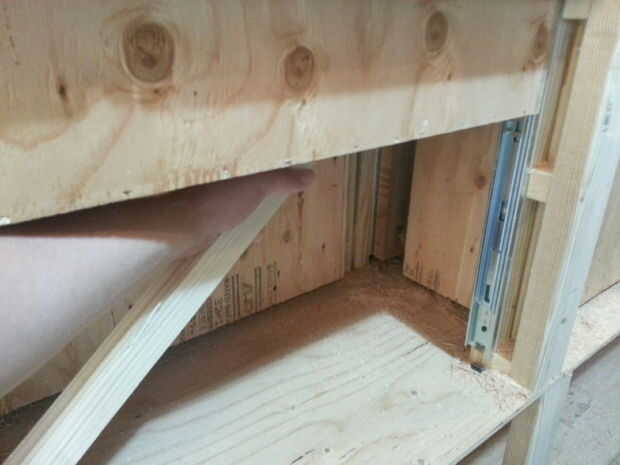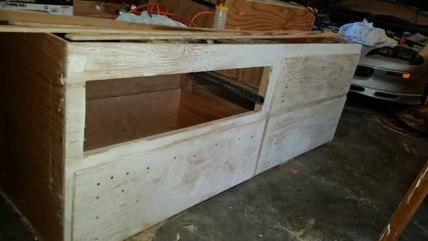 Para que coincida con los cajones a las diapositivas puse el marco entero de la cama de espaldas. Las diapositivas se atornillan a la cama y luego tira de ellas hacia fuera como van verticalmente. Apuntalado el cajón en un pedazo de madera de desecho a levantar sobre el armazón y luego los cuadrados para arriba y me atornilló las correderas para los cajones. Lee confuso porque realmente no soy un chico de cajón. Cuando llego a mejorar los métodos para hacerlas que actualizar esto o hacer un nuevo ible. Esperemos que las fotos y las notas de la foto pueden ayudar a explicar esta parte más.