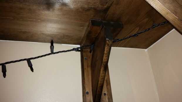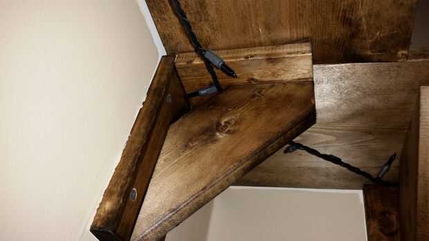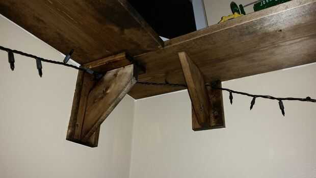 La primera es crear una L en forma de pieza de las 2 piezas de 1 x 4 sólo se cortan paso anterior. La parte de la L en forma de pieza que se pegue hacia fuera perpendicular a la pared deben sentarse en la parte superior de la pieza que es paralela a la pared. De esta manera la carga de peso estará en la madera y no los tornillos que sujetan la articulación juntos.
