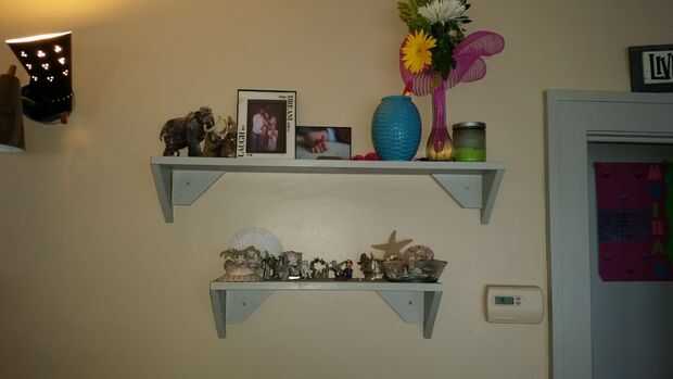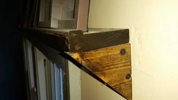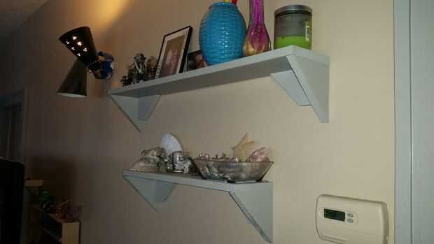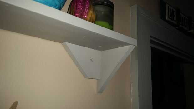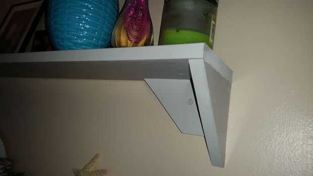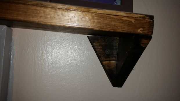 Para cada soporte en fin use pegamento y tornillos para unir dos triángulos a para fijar ángulo recto. Esto se une ahora a la pieza de estante. Al seguro el estante a la pared del funcionamiento tornillos a través de la el soporte que se encuentra a lo largo de la pared. Estos soportes no pueden parecer fuertes pero resistirá muy bien.