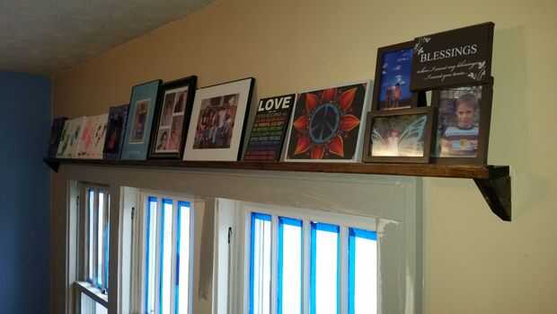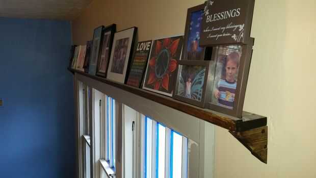 El carril de la foto es una estantería que hice para colgar en una ventana diferente que se utiliza exclusivamente para exhibir arte enmarcado. Tiene construcción simple de 1 x 4. Puesto que se lleva a cabo casi en su totalidad en que el marco de la ventana trim tiene casi no necesita soportes. Para crear el riel que sostiene el Marcos utilicé una pieza de guarnición muy pequeña. El ajuste es aproximadamente 1/4 de pulgada de espesor y 3/4 pulgada de ancho y es la longitud de la plataforma toda.