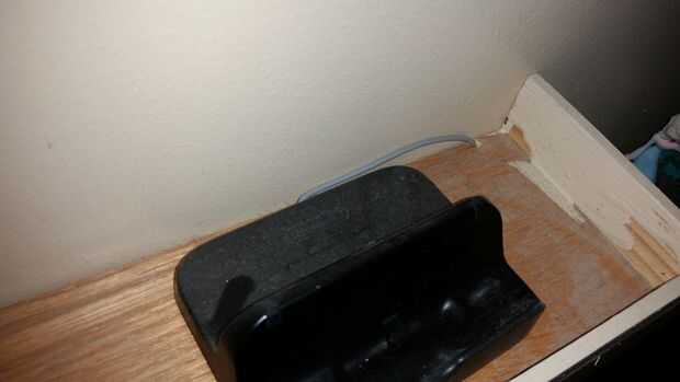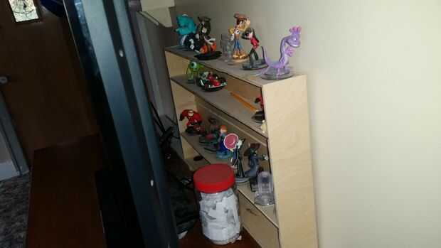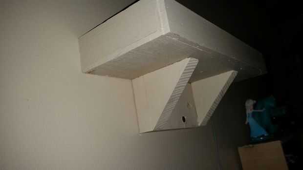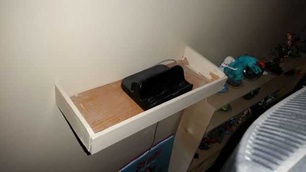 La plataforma sí mismo fue hecha enteramente de madera y utiliza los mismos métodos de soporte triangular como muchos de mis otros anaqueles. Este estante es único con su guía que va alrededor de él para fijar la u de wii remoto con seguridad. Fue hecho con madera contrachapada muy fina que era perno clavado en la plataforma. Hay una pequeña ranura cortada en la parte posterior de la plataforma para hacer espacio para el cable de carga. El cable debe mantenerse en su lugar y atornillar la repisa en la pared. La ranura es error suficiente para el cable pero más pequeño que la cabeza del conector para que no se caiga hacia fuera.
