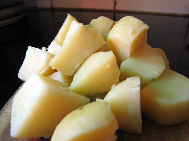 Cortar patatas hervidas en mordedura de tamaño, aproximadamente 1".