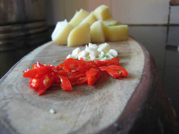 Agarra su tabla de cortar y picar los chiles y el ajo finamente.