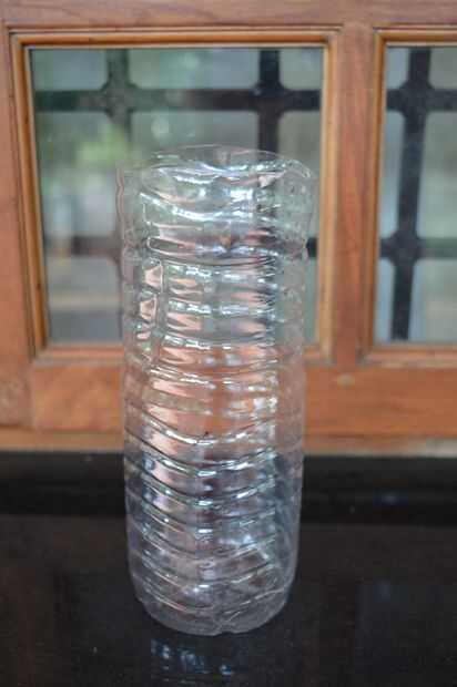 Por último, rellenar en el suelo. Sugiero que se pone el suelo, capa por capa y con una pizca generosa de agua entre cada capa. Esto garantiza que todas las capas húmedo. También hacer un agujero en el centro para que el agua llegue a la parte inferior de la botella también.
