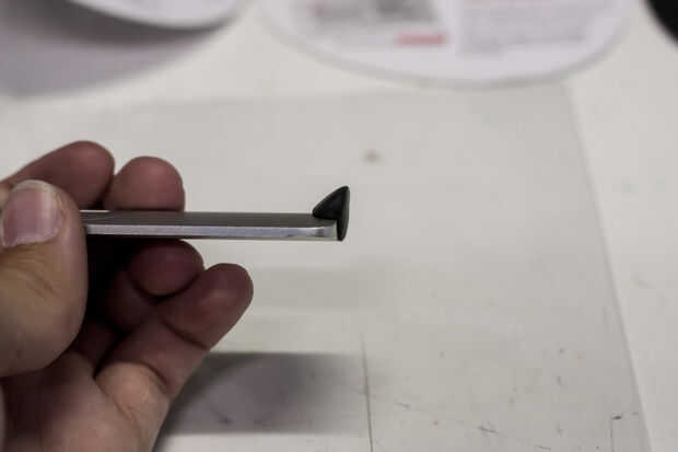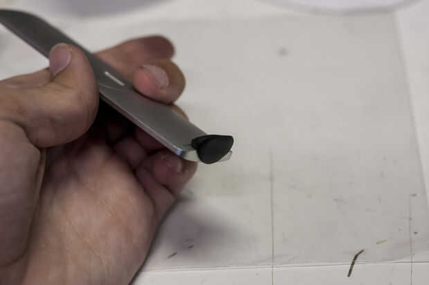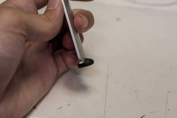 Para crear la base para el control remoto estar de pie, tome una pequeña cantidad de Sugru (aproximadamente 1/4 a 1/2 de un paquete) y moho en la parte inferior del mando a distancia como se muestra en las imágenes. Usted querrá asegurarse de que el Sugru se une a las superficies de la parte inferior y la parte posterior del control remoto. Tratar de hacer la parte inferior de la pieza moldeada como plano y nivel como sea posible. Mientras que los del moldeo a presión, puede ayudar a mantener la distancia verticalmente para ver cómo estará el mando a distancia cuando el Sugru cura; Tenga en cuenta que es suave y flexible al principio y a no valerse por sí mismo.